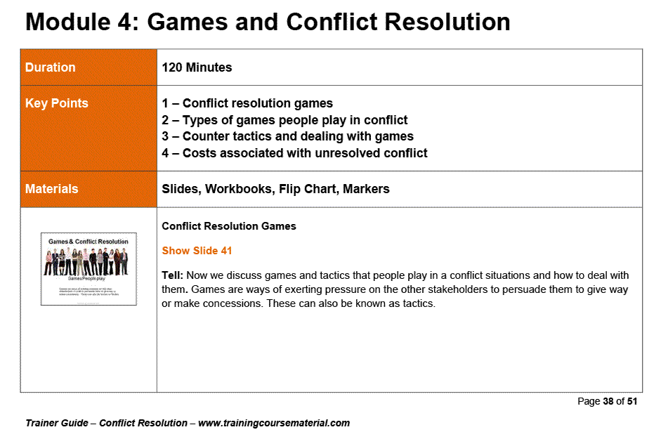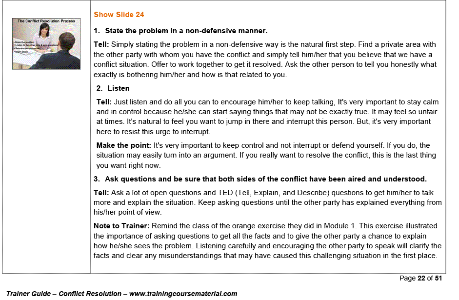 Train participants in proven techniques for resolving conflicts swiftly and effectively in any situation.