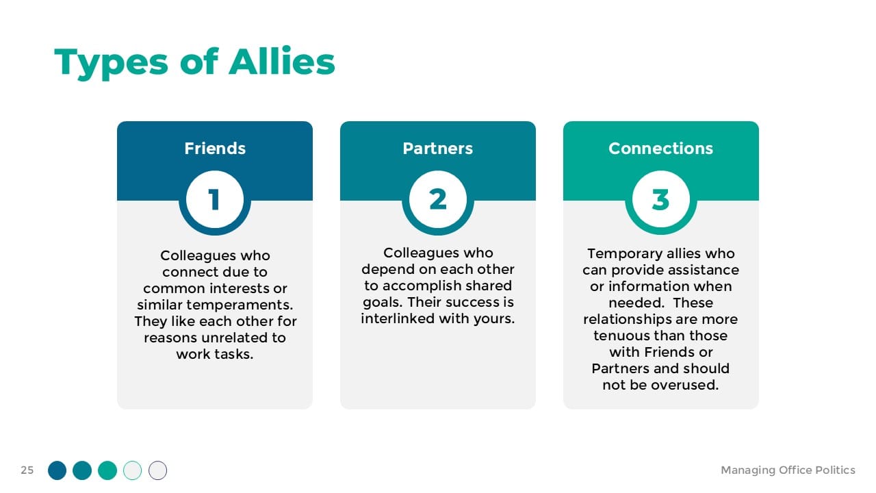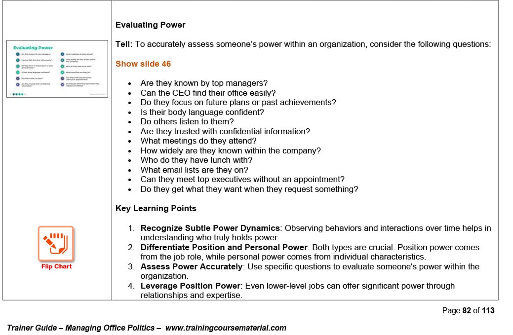 • Real-world case studies, skill practice activity demonstrating practical office politics strategies
